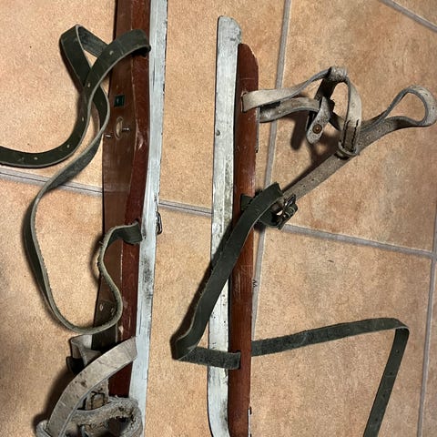 Skridskor rembindning metall läderremmar. Retro antika men väl fungerande