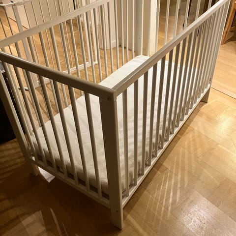 Spjälsäng Ikea, höj och sänkbar 60cm x 120cm med madrass och vyssan lull tassar 400kr.