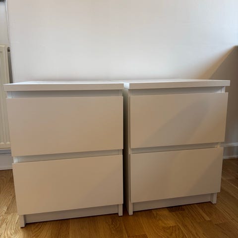 En vit byrå med 2 lådor (rullar lätt) modell Malm från IKEA.