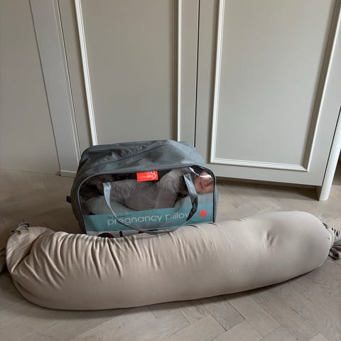 bbhugme gravidkudde i grå färg, den lpbga modellen alltså inte amningskudden. Lång, avlång kudde utformad för att ge stöd till kropp och mage under graviditet. Kudden kan formas efter behov och används exempelvis i sängen eller soffan för avlastning vid vila och sömn. Går jättebra att använda även som amningskudde