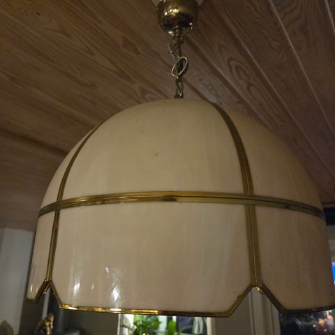 40 cm i diameter. Kedja/kabel 130cm (kan kortas ner). Mässing/gulmetall och akryl i rosa ton. En E27-sockel.
