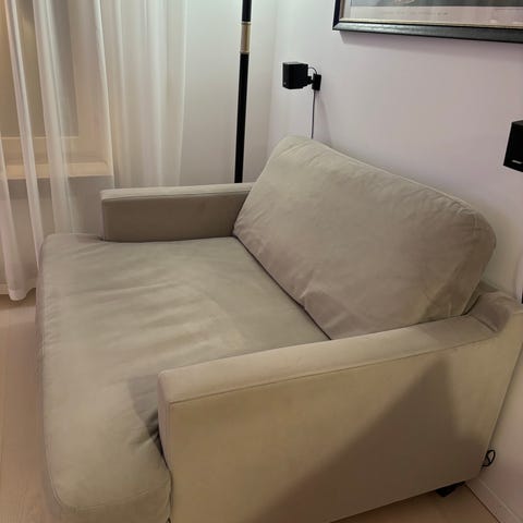 Bekväm och lätt schäslong i beige vegansk mocka med kromad ram, mycket bra skick. Bortskänkes mot avhämtning i helgen. Finns på Södermalm.