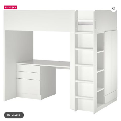 Superfin loftsäng från vida XL med måtten 75x180. Sovhöjden är 155 cm. Två bra skrivbordsplatser. Sängen köptes 2025 och säljs pga flytt. Sängen bör hämtas senast 15 mars.