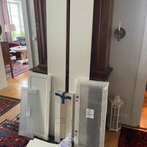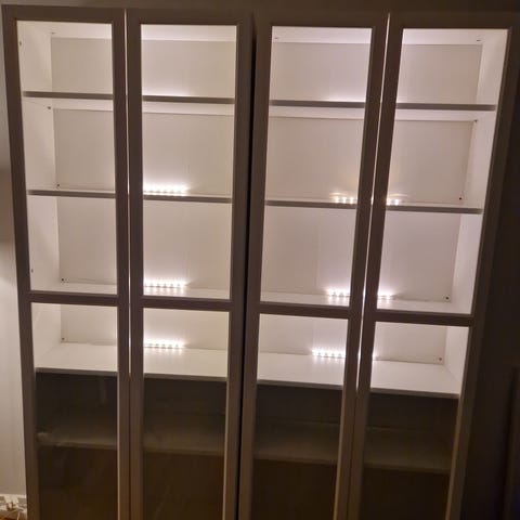 Två Billy bokhyllor med glasdörrar och ett cd ställ