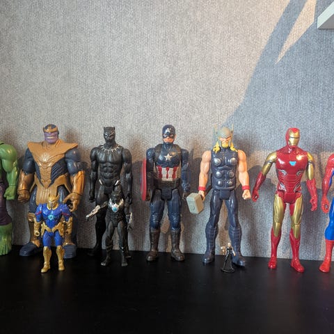 Två Spider-Man samt en av bland annat Venom, Thor, Captain America och Ironman.