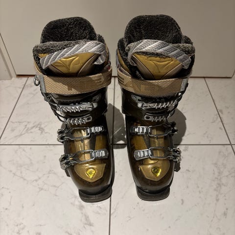 Nordica pjäxor storlek 42,5 i hård plast med flera justerbara spännen över fot och skaft. Färg i guld med detaljer i svart, rött och silver. Passar för alpin åkning och ger stabilitet och stöd runt fot och underben. Innerstövel med vaddering för ökad komfort. Lämpliga för användning med alpina skidor och bindningar som är kompatibla med traditionella pjäxsulor.