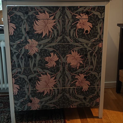 Säljer en Hemnes byrå från Ikea, tapetserad med Svenskt Tenn Eldblomman.