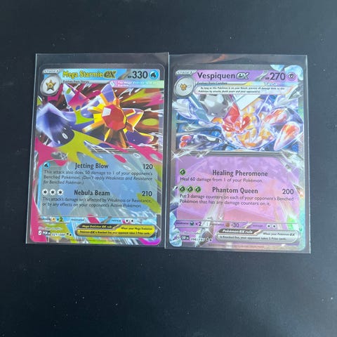 Pokémon Feraligatr samlarkort 2-pack. Två olika Feraligatr-kort från Pokémon Trading Card Game visas i standardstorlek och skyddande plastfickor. Motiven föreställer Feraligatr i två olika illustrationer med respektive attack- och energiinformation tryckt på kortens framsida. Baksidorna har klassisk blå Pokémon-design med pokéboll i mitten. Lämpliga för samling eller spel i Pokémon TCG.