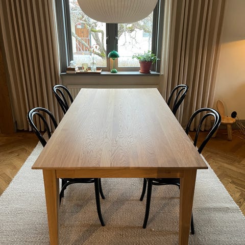 Bra begagnat skick. Ytan är något mörkare där bordet använts mest – normalt för oljad ekfanér som påverkas av ljus och användning.