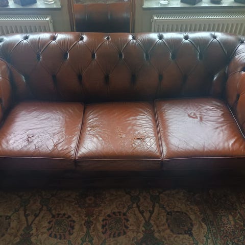 Möblerna har den klassiska Howard-designen med rundade armstöd, dekorativa nitar och djupa, sköna sittdynor. Skinnet har en naturlig och fin patina som ger mycket karaktär och exklusiv känsla.