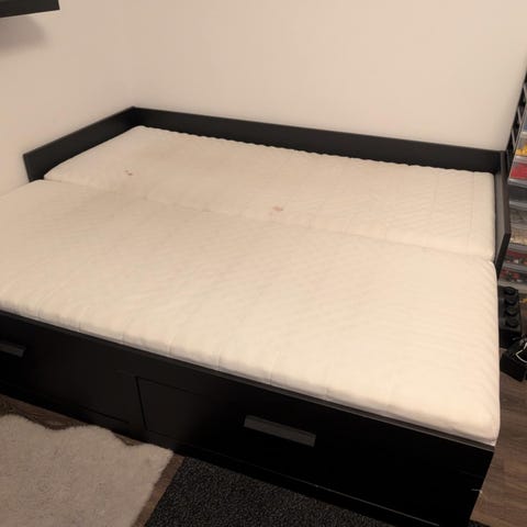 IKEA säng med Vesteröy pocketresårmadrass och Tuddal bäddmadrass (tvättad men lite småfläckar-kan exkluderas om önskas).