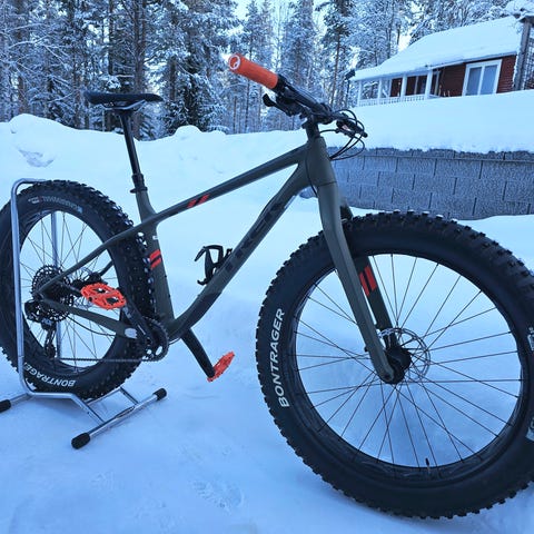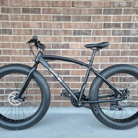Fatbike mountainbike för unisex med ramstorlek L och 24" hjul. Cykeln har grova däck anpassade för körning på snö och löst underlag. Utrustad med sadel enligt bild och standard platta pedaler. Passar för terrängcykling och vardagscykling i varierande underlag.