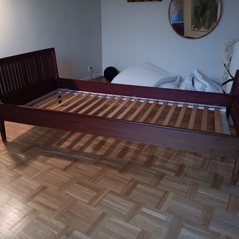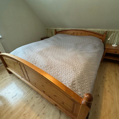 Fin sängram för 180 cm säng i oljad ek med ribbatd huvudgavel. Ramen är i trä med varm träton och består av huvudgavel, sidor och mittbalkar. Passar som bas för en säng med lösa ribbor eller botten och madrass som kompletteras separat.