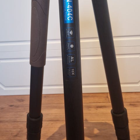 Sirui kolfiberstativ (M-3204X) tillsammans med Benro S6 videohuvud. På videohuvudet har vissa klisterdekaler/slitdetaljer släppt.