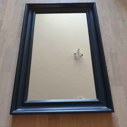 Väggspegel Ikea Hemnes, 90 x 60 cm. Kraftig profilerad ram i mörkt trä, något sliten. Spegelglaset är i fint skick.