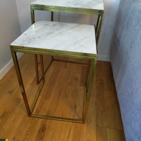 Satsbord från Mio, med metalben och vit bordskiva. Det största bordet mäter 50x50cm samt höjd 57,5cm. Slitet skick, därav mycket billigt fast pris.