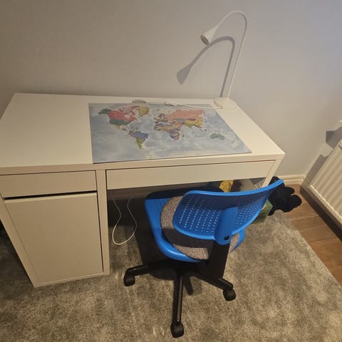 Mindre skrivbord och skrivbordsstol, båda från IKEA.