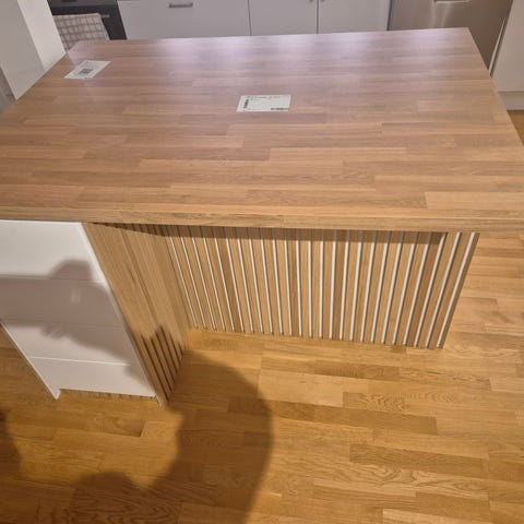 Bänkskiva till köksö i valnöt. Längd 240 cm, bredd 117 cm, höjd 6 cm. En torr fläck på bänkskivan som behöver olja( se foto). Hällen ingår inte. Hålet för hällen är till en 80x50 cm häll.
