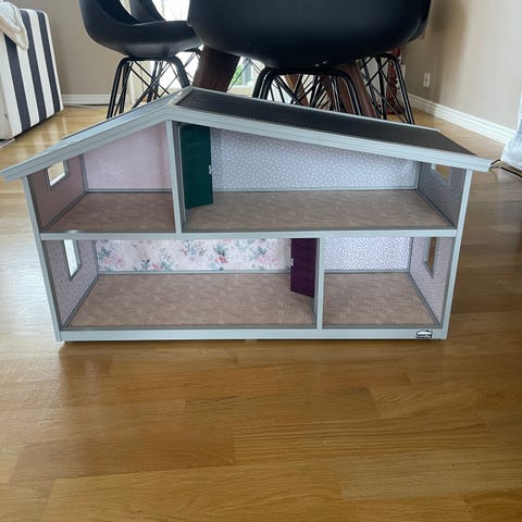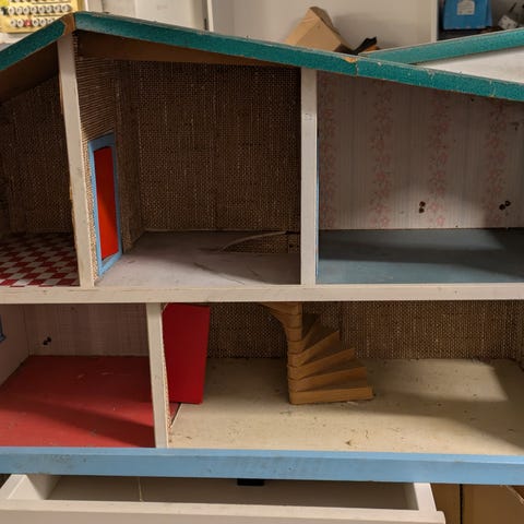 Jag säljer ett dockskåp med undervåning från 70-talet. Trappan saknas och en list baktill, samt en hörnlist på undervåningen är trasig. Lite märken på tapeter, ytterväggar mm.
