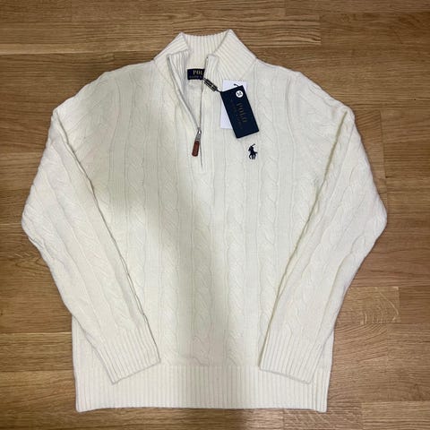 Ralph Lauren zip tröja för herr i storlek M. Stickad modell i vit färg, tillverkad .Tröjan har halv dragkedja fram och kabelstickat mönster samt broderad logotyp på bröstet. Passar till vardagsbruk och kan kombineras med både skjorta och t-shirt.