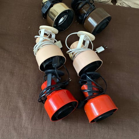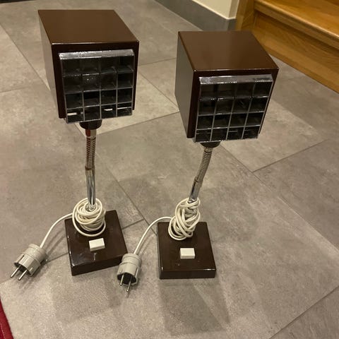 Hans-Agne Jakobsson Elidus -kuben vägglampor 60/70-tal i orange metall. Lamporna är utformade som rektangulära boxar med galler framtill och monteras på vägg. Märkta med Elidus typ 9002, max 40W och 230V.
