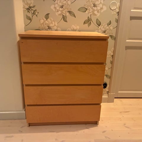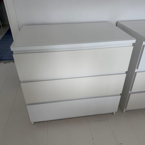 Malm byrå från IKEA med 6 lådor, vit, 160x78 cm. Några märken finns. Glasskiva ingår.