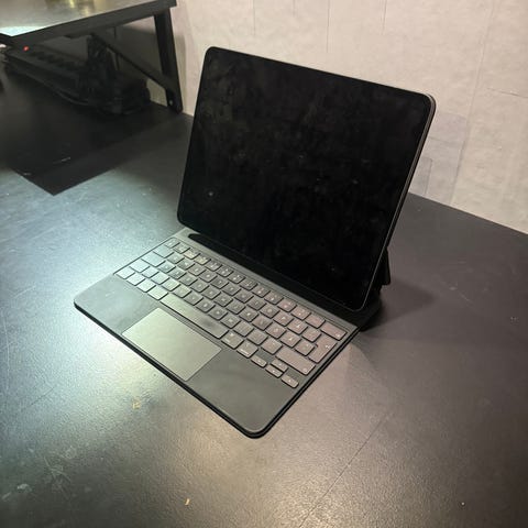 Apple iPad Pro surfplatta med 128 GB lagringsutrymme. Enheten har pekskärm och används tillsammans med ett tangentbordsfodral enligt bilderna. Surfplattan lämpar sig för vardagsanvändning som webbsurf, mediauppspelning, appar och enklare arbete. Skärm och baksida visas i bilderna för att ge en uppfattning om skick och eventuella märken.