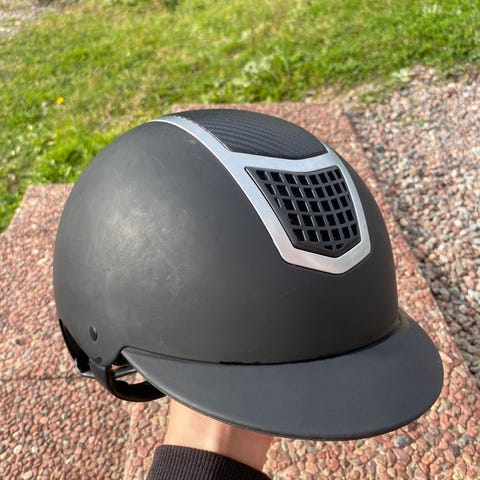 Hansbo ridhjälm i svart färg, storlek 59. Hjälmen har dekorativa ljusa detaljer upptill och justerbar inredning. Invändigt finns märkning med storlek samt CE-märkning enligt gällande säkerhetsstandard för ridhjälmar.
