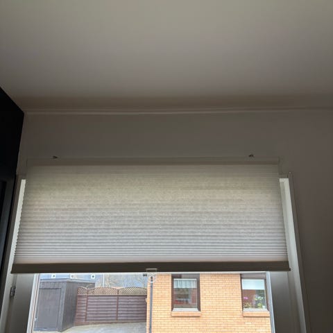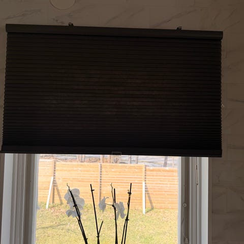 IKEA plisségardin i grå färg. Gardinen är av textilmaterial och monterad i en dörr- eller fönsterkarm.