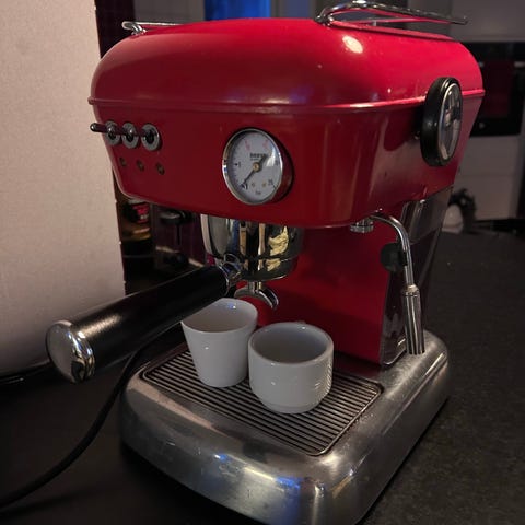 En gammal fin dubbel mockakanna för spisen. Rostfritt stål och mässing. Precis som en Bialetti.