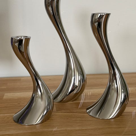 Georg Jensen ljusstakar i böljande, skulptural form. Tillverkade i blankt rostfritt stål. Passar för användning som dekorativa ljushållare i hemmet, exempelvis på bord eller hylla. Säljes som set enligt bilden.