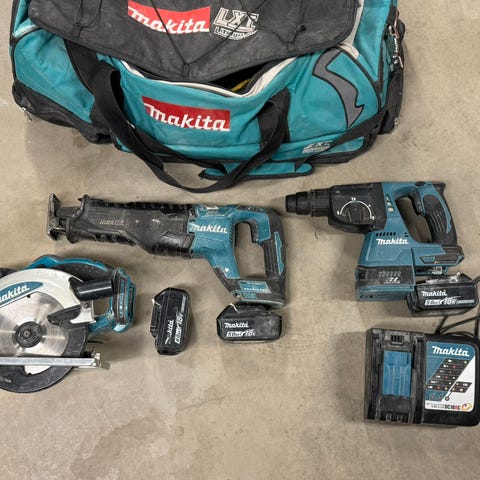 Makita LXT verktygspaket med 18V batteriverktyg. Paketet innehåller bland annat cirkelsåg Makita DSS610, tigersåg samt borrhammare (modellbeteckning framgår på verktyget). Till verktygen ingår flera 18V-batterier samt en Makita-laddare.