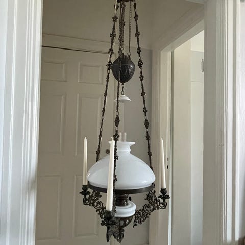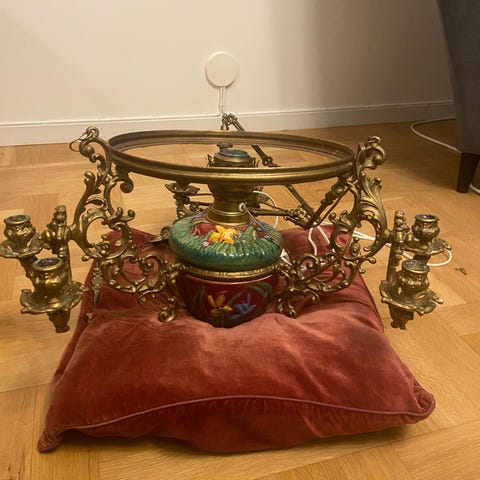 Antik taklampa i jugendstil. Fotogenlampa omgjord till elektrisk.