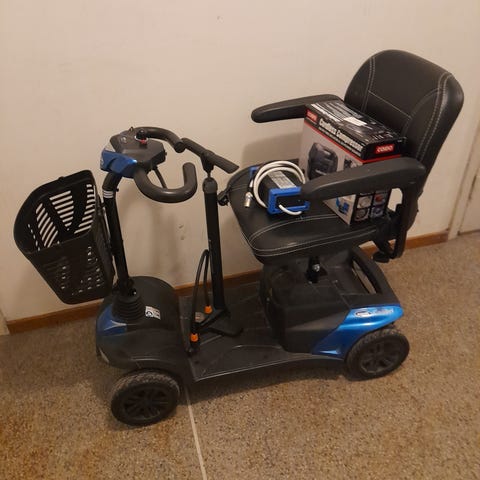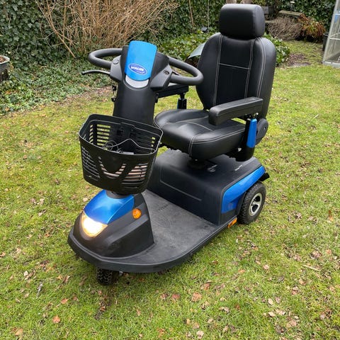 Invacare Leo elscooter i svart. Fyrhjulig med korg framtill, justerbar stol med armstöd och ryggstöd samt backspeglar. Liten, smidig och lättstyrd, funkar bra i butiker och andra inomhusmiljöer. Toppfart 10 km/h - funkar bra för relativt långa resor. Lättmanövrerad - reglagepanel med tydliga knappar och indikatorer på styret. Isärtagbar för smidig transport i bil. Säljes med instruktionsbok enligt bild.