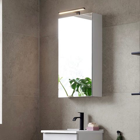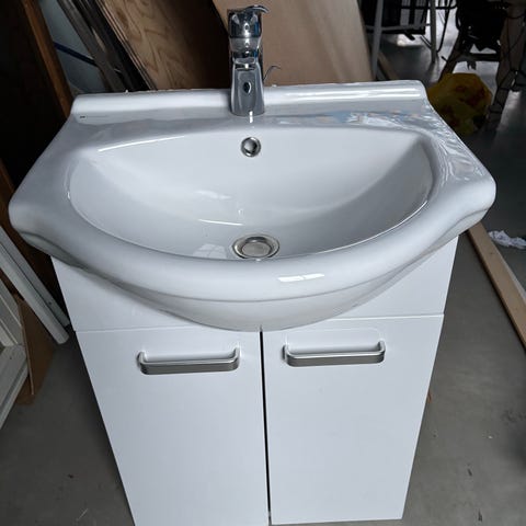 Badrumsskåp med spegel och integrerad LED-belysning i vit färg. Skåpet har dubbla spegeldörrar och flera hyllplan för förvaring av badrumsartiklar. Mått ca 60 cm brett, 64,2 cm högt och 16,5 cm djupt, med inre hyllplan på cirka 42 cm bredd och 15 cm djup. LED-belysningen är placerad upptill och kan dimras i flera lägen via sladdbrytare. Skåpet är avsett för väggmontering ovanför tvättställ i badrum eller toalett.Säljes pga att jag bytte stil i badrummet.