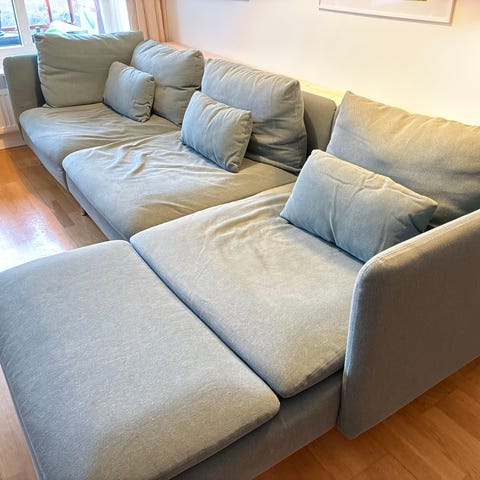 Inköpt för 1,5 år sedan och använts varsamt i rök- och djurfritt hem. Inga fläckar eller slitningar i tyget.