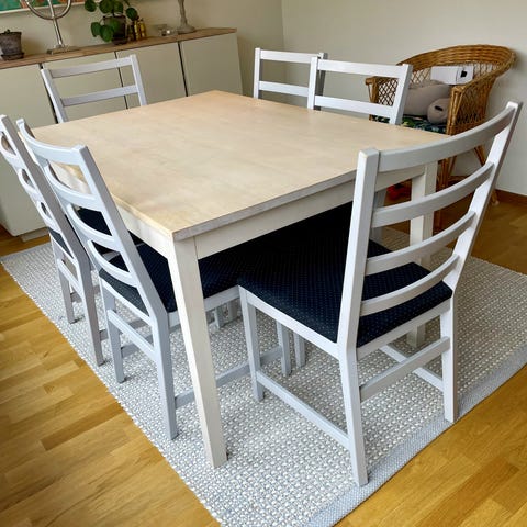 Skivan har en synlig repa/skada (se bild) och skulle må bra av en lätt omslipning och ny oljning för att bli i toppskick igen. I övrigt stabilt och välbyggt bord med lång livslängd kvar.