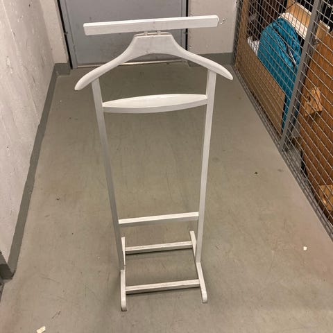 IKEA klädförvaring i form av öppen hallställning i vit metall. Ställningen har översta stång för upphängning av jackor och kläder samt hyllplan nedtill som kan användas för skor, korgar eller annan förvaring. Passar i hall, sovrum eller klädkammare för öppen och lättillgänglig förvaring av ytterkläder och accessoarer.