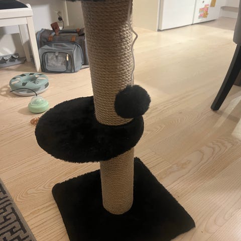 Katträd med klösställning i två nivåer. Stommen består av pelare med klösyta och en övre plattform klädd i grått tyg. På den översta pelaren finns en hängande leksak för katten. Passar för inomhusbruk till katt för klösning, lek och vila.