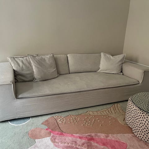 En otrolig soffa från Melimeli. Använd sedan 2022, märks och syns såklart men inga hål eller enorma kaffefläckar. Älskar denna soffa innerligt men behöver tyvärr köpa en större pga fler barn.