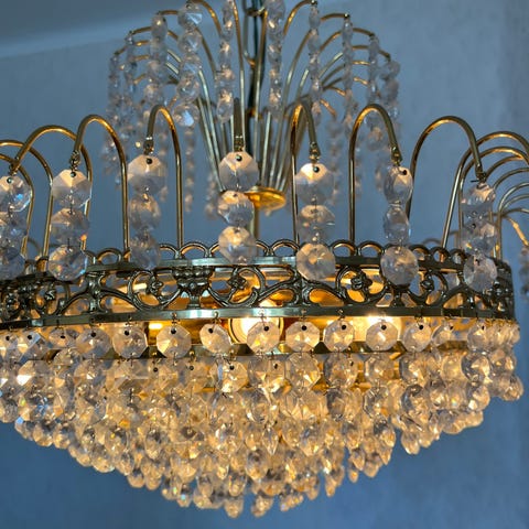 Lampan ger ett varmt, mjukt och exklusivt sken. Prismorna reflekterar ljuset fint och skapar en levande och elegant känsla i rummet. Perfekt över matbord, i vardagsrum eller i ett hem med klassisk eller romantisk inredning.
