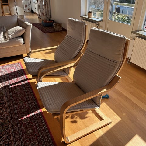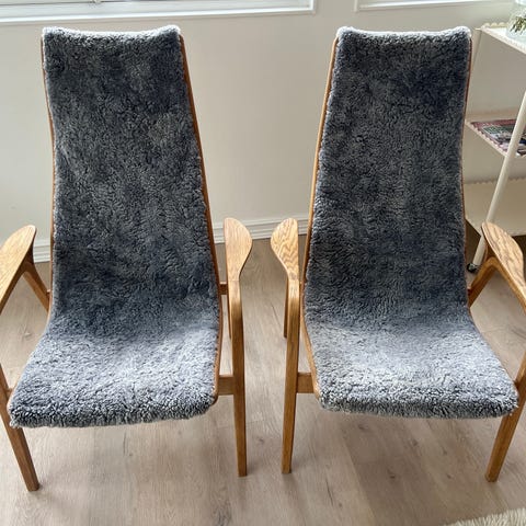 Två fåtöljer i furu från Swedese av Yngve Ekström. Säljes endast tillsammans. Pris 5 500 kr för båda eller högstbjudande.