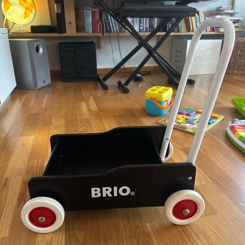 BRIO gåvagn i rött och gult med vit stålbygel och vita hjul. Klassisk modell som kan användas som stöd när barn lär sig gå och som vagn för att köra runt leksaker. Lämplig för små barn som tränar balans och motorik inomhus.