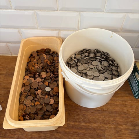Blandad samling mynt; mestadels 5 och 2-öringar. Mynten verkar komma från olika årtal och kan vara av olika metaller. 4,3 kg. Skrotpris ligger fn uppskattningsvis på 90-100 kr/kg.
