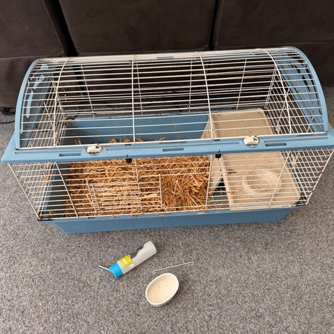 En rejäl rengjord Smådjurs bur i använt skick med blå plastbotten och galler i metall. Lämplig för mindre djur som kaniner eller marsvin. Mått: 158 cm bred och djup 77,5 cm och höjd 57,5 cm. Öppen ovansida och gallerdörrar på sidan och med galler runtom som ger god ventilation och överblick. Plastbotten är upphöjd runt kanterna för att hålla strö och spån på plats. Passar för användning inomhus eller utomhus på plan yta.