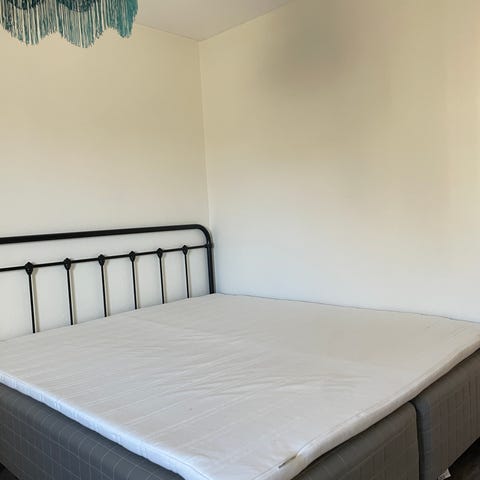 Kontinentalsäng i grått tyg med tillhörande bäddmadrass om så önskas. Sängen består av två nedre resårdelar och en övre madrassdel. En mjuk sida och en fast sida.