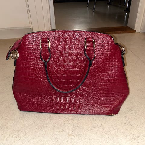 Stilren vinröd kuvertväska med elegant guldfärgad kedja. Väskan har magnetlås och insidan är fodrad med ett brunt tyg med blommönster. Perfekt för dig som vill ha en enkel men snygg accessoar till din outfit.
