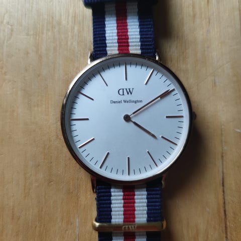 Fin Daniel Wellington klocka med nytt battery och armband i Rött, Blått & Vitt.