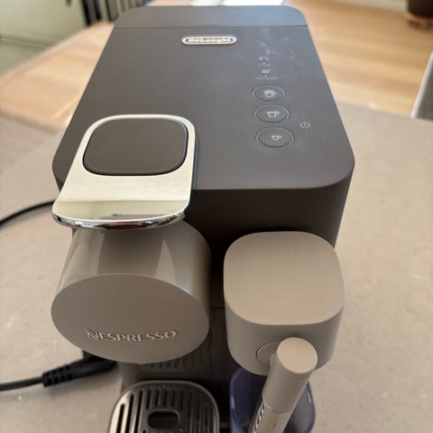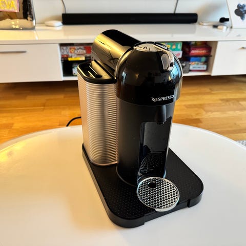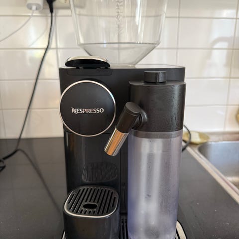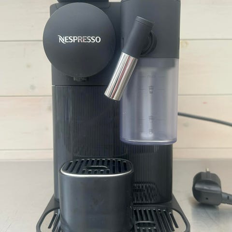 De'Longhi Nespresso kaffemaskin i svart utförande. Maskinen är kapselbaserad och har integrerad mjölkbehållare och ångmunstycke för drycker med mjölk. På ovansidan finns panel med flera förvalda dryckesknappar och indikatorlampor. Uppsamlingsgaller och droppbricka är placerade framtill. Passar för tillredning av olika typer av kaffe- och espressodrycker med Nespresso-kapslar i hemmamiljö eller mindre kök.
