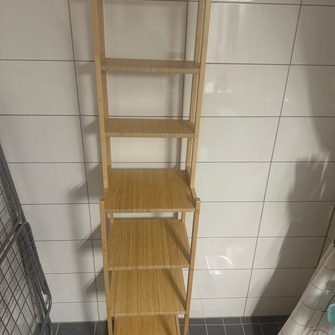 Handdukshängare i bambu. Fint skick. Tar minimalt med plats när den är ihopfäld, 85 cm hög. Utfäld är den 77 cm hög och 45 cm bred.